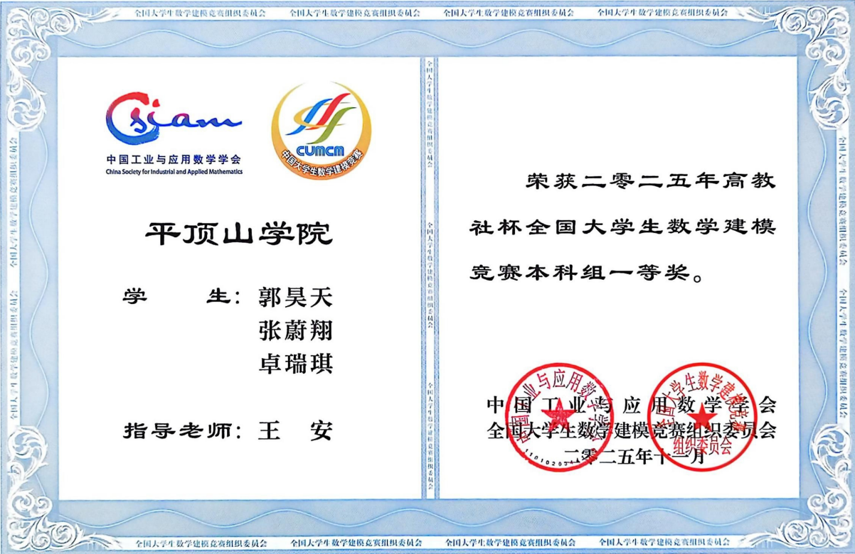 在全国大学生数学建模竞赛中,卓瑞琪团队成功斩获本科组国家一等奖。该奖项获奖率仅为0.48%,不仅是对团队实力的高度认可,更实现了我校在该项赛事中的历史性突破。