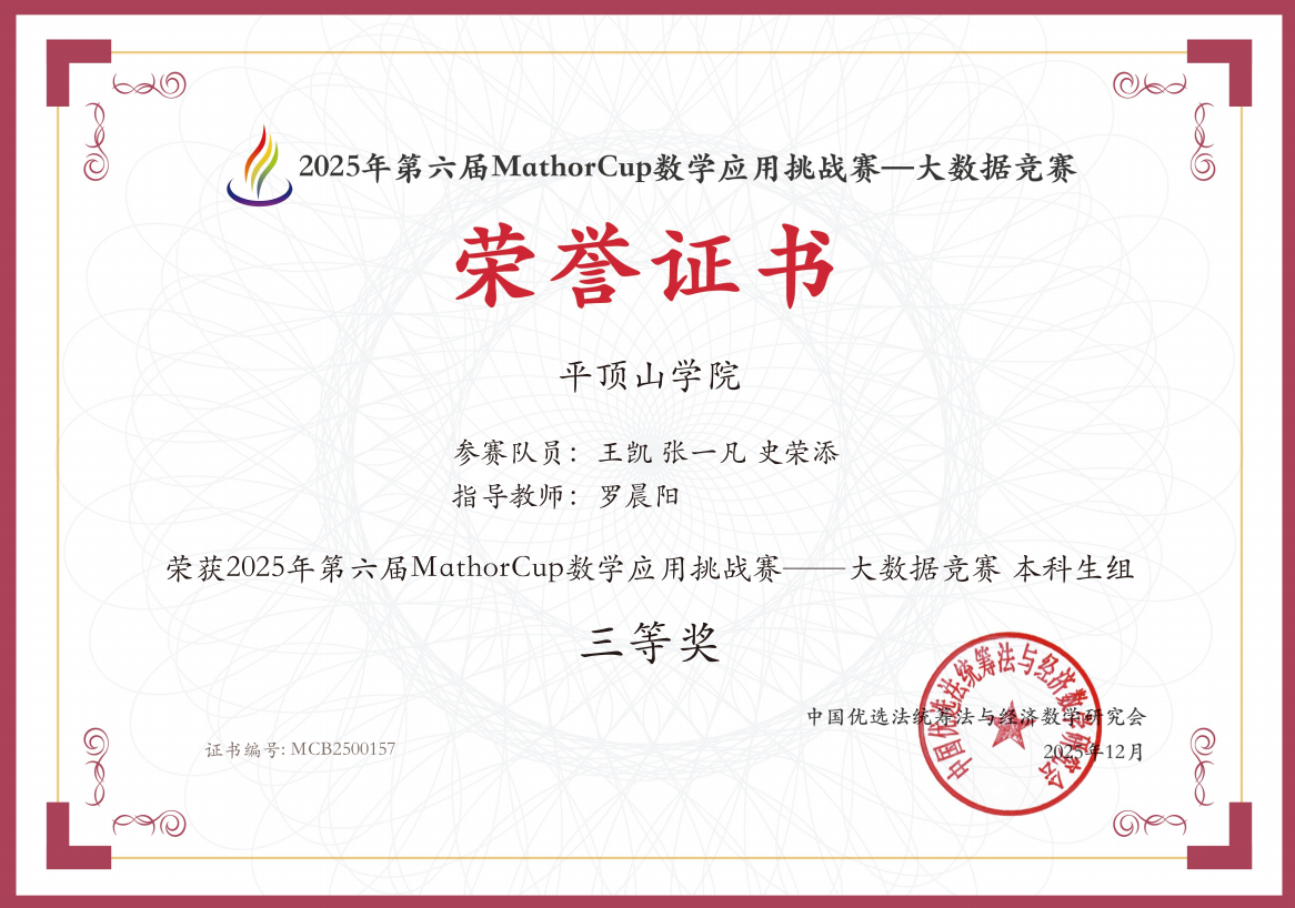 近日,2025年全国大学生数学建模竞赛与第六届mathorcup数学应用挑战赛-大数据竞赛结果相继揭晓。我院大数据管理与应用专业卓瑞琪团队和王凯团队凭借扎实的专业功底、出色的团队协作与创新的解题思路,在两大高规格赛事中脱颖而出,分别斩获国家一等奖、国家二等奖与国家三等奖,为学校赢得了荣誉。